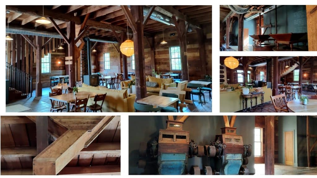 The expansive milling room now has comfortable couches and a variety of tables. Some of the original machinery adorns the space as a nod to the work that had taken place here.