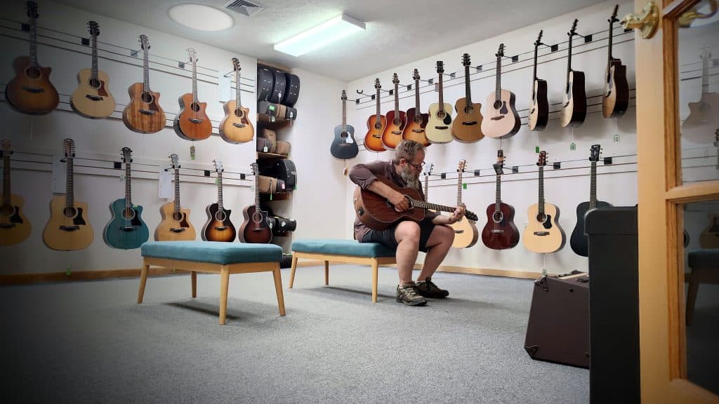 We pulled into the parking lot. There was a long building of businesses, each standing in line waiting for customers. All were dressed in a tan-sided facade. We read the labels above the doors, “Traverse City Guitar Company.” “This must be it.” Chuck swung the door open.