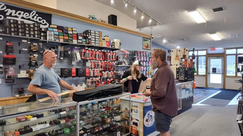 When we brought our selections to the counter, Chuck asked about the Ainesis brand guitars. “They’re made right here in Traverse City.” The friendly clerk motioned to a gentleman in a blue shirt. “That’s Gene. He makes the guitars by hand in his shop.”