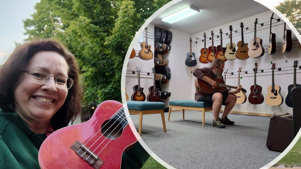 Every kind of guitar hung on the wall. It felt like a “Willy Wonka World of Guitars!” A clerk popped his head into the room. “Try any guitar or uke. Let us know if you have any questions.” Chuck set to stumming and I headed to a ukulele display.