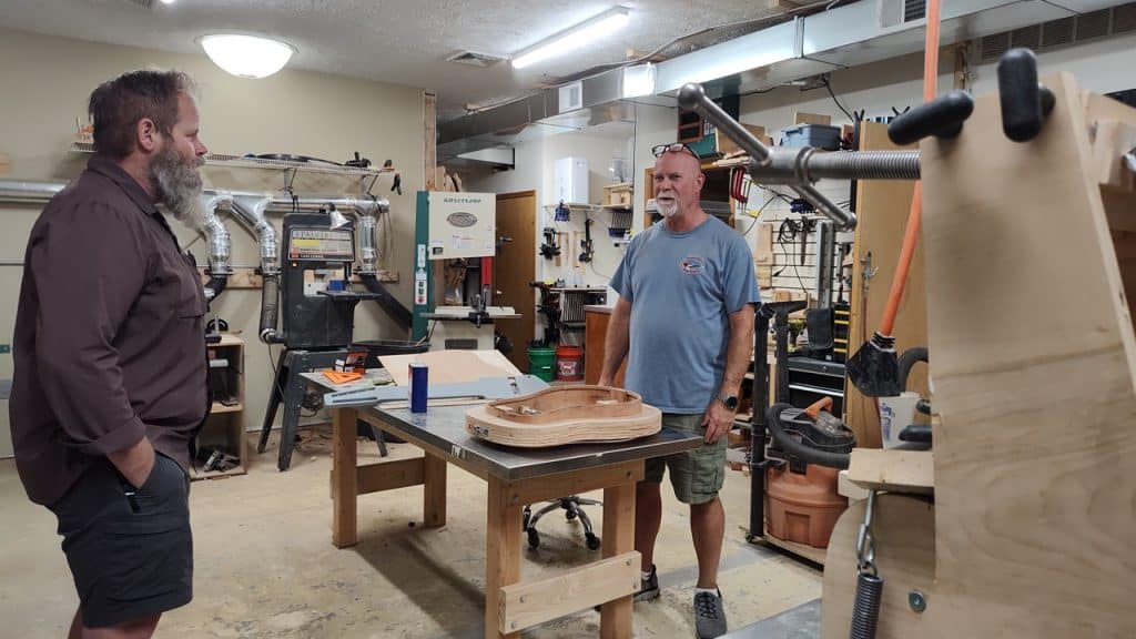 “Come on.” Gene swooped his hand through the air, “It’s not a bother.” With a hop in his step, Gene led us along the individual practice rooms and out the back door. Gene and Chuck’s conversation moved effortlessly. Chuck, who holds an array of eclectic understanding, can easily review a vast range of subjects. “What wood works the best?” Chuck inquired.
