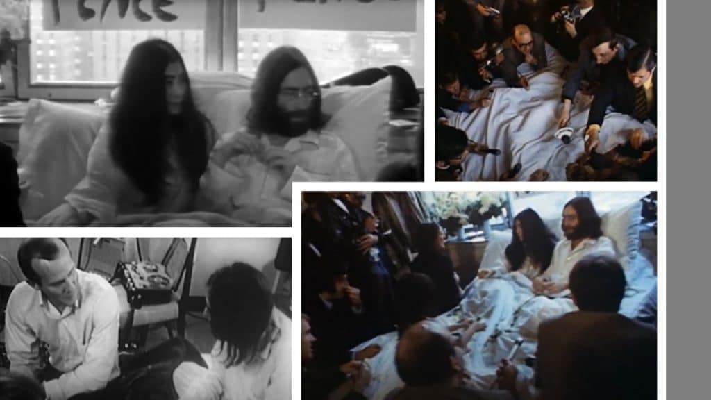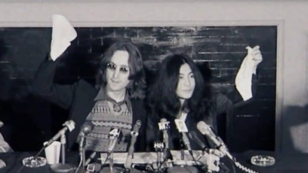 Knowing the press would follow them on their honeymoon, John and Yoko Ono chose to spend the week in bed as a peaceful protest, “Bed – In.” During an interview, where the couple was cozy under blankets, John said, “When it comes down to using violence, then you’re playing the system’s game.” John had pointed out, “Once they’ve got you violent, then they know how to handle you.”