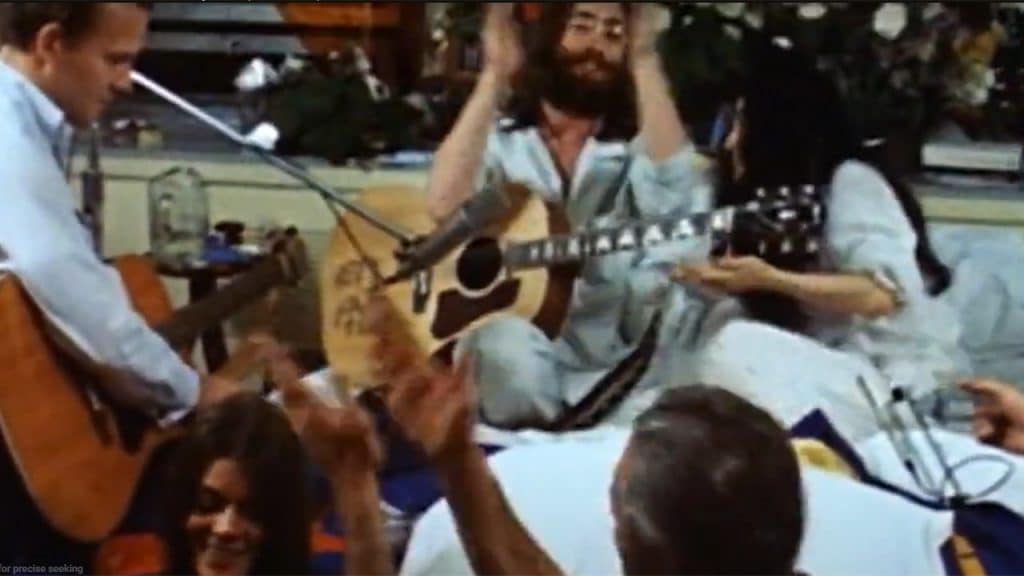 From their bed John Lennon, Tommy Smothers and Yoko Ono led a group in the live recording of the song, “Give Peace A Chance.”