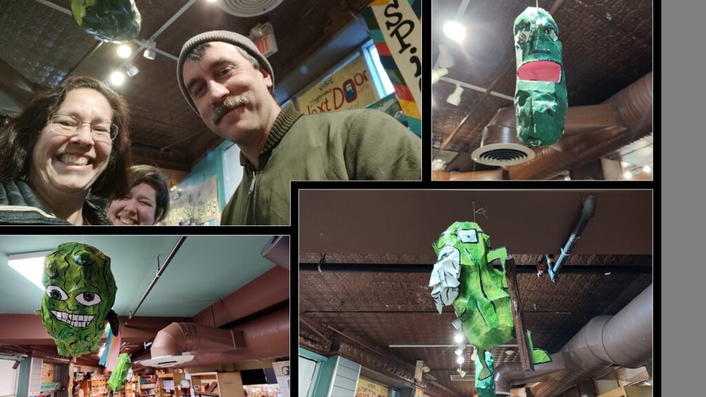 “Look at these pickles!” I gasped at the papier-mache offerings hung from the ceiling. “You don’t see that every day.” I quietly commented with a grin.