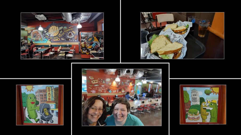 We stepped up to the kiosk. “Let me know if you have any questions.” The gentleman offered reclaiming the menus. Charlotte went to work placing our order, so I asked, “Who made the pickles?” I raised my brow and gestured to a pickle swaying from the ceiling.